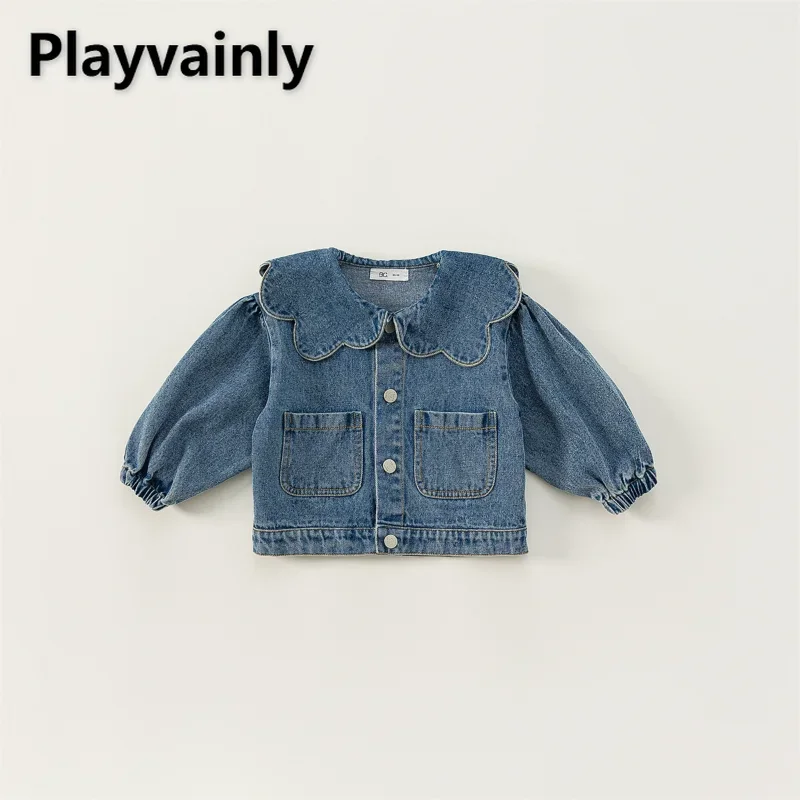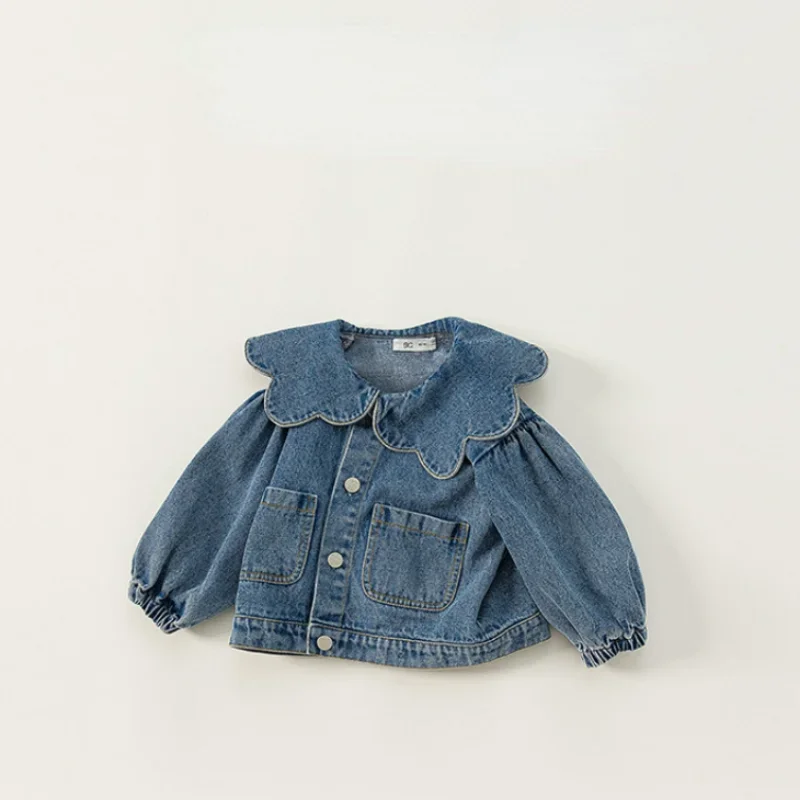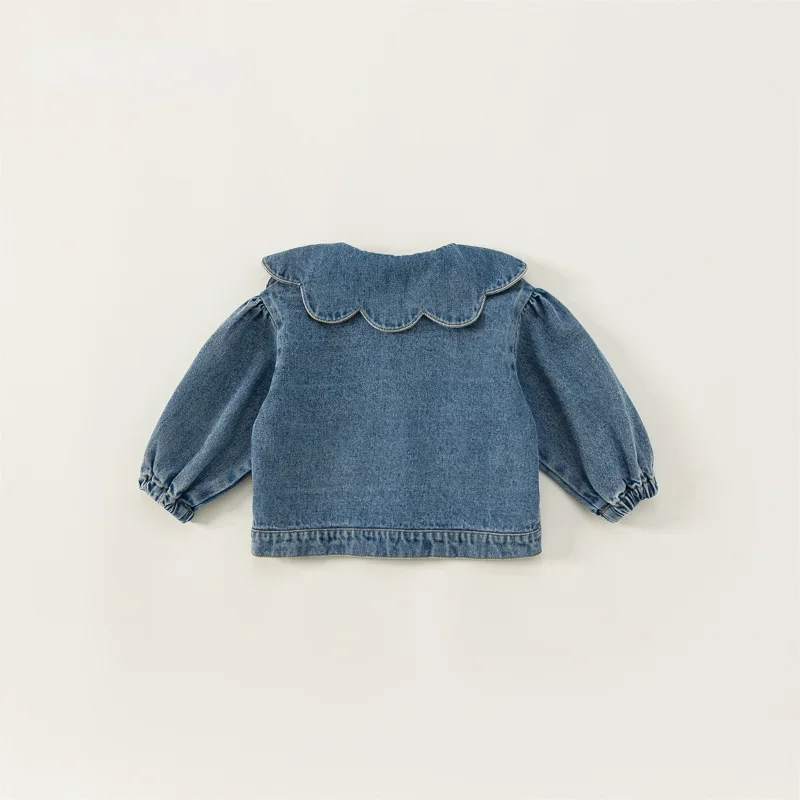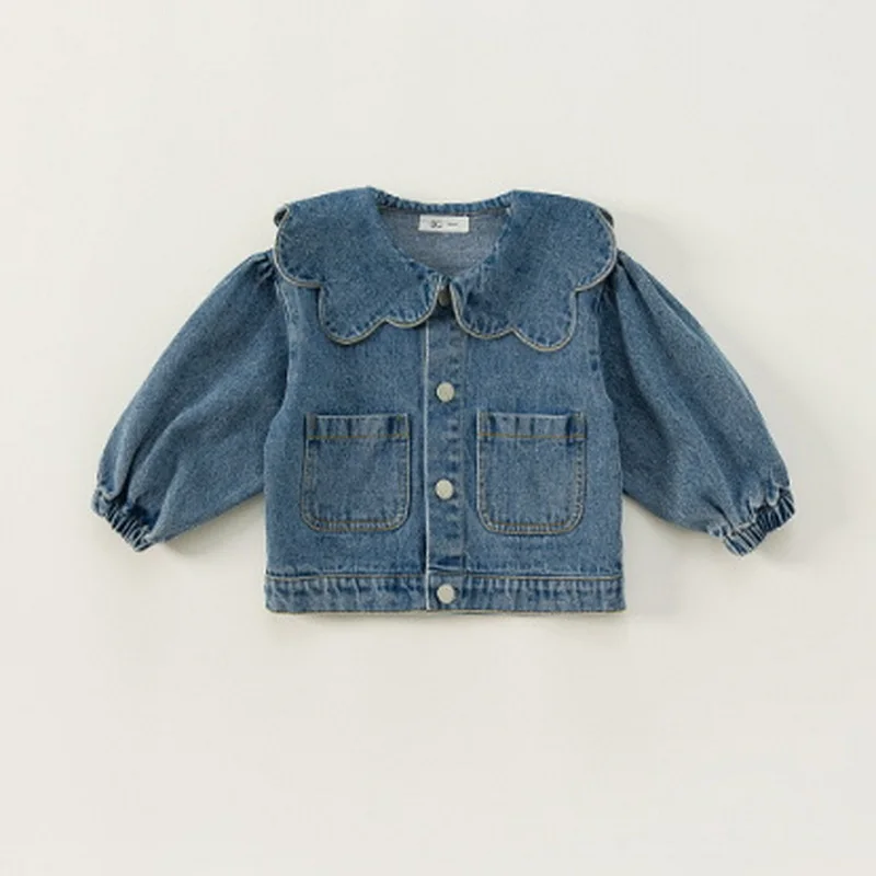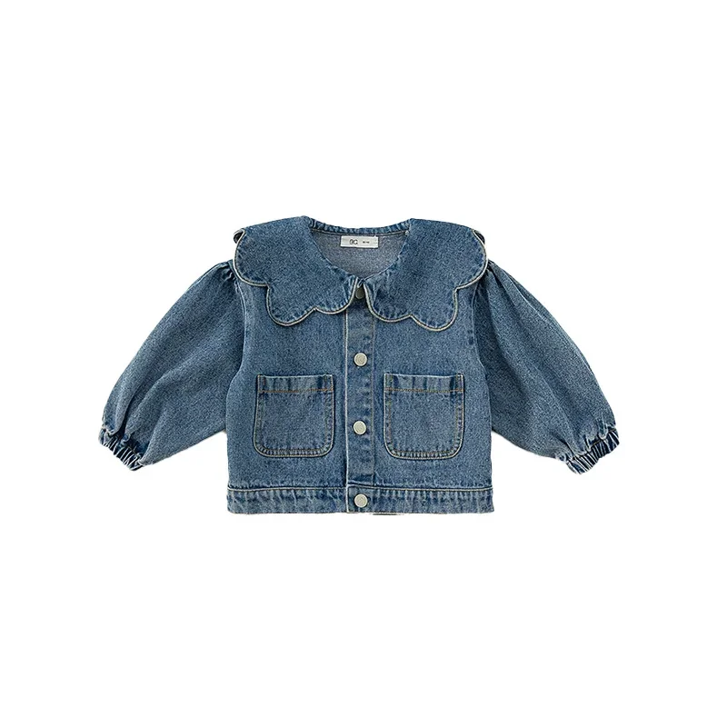 New Spring Autumn Children Denim Coat Ruffle Collar Puff Long Sleeve Jackets Baby Girls Fashion Versatile Clothes E82075